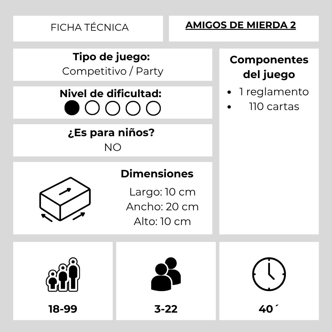 ¿Creías que ya conocías a tus amigos de verdad? Pensalo de nuevo. Amigos de Mierda 2 es el juego que viene a poner a prueba esas amistades y a revelar el lado más oscuro (y divertido) de cada uno. Este juego es completamente independiente, lo que significa que podés jugarlo solo o combinarlo como una expansión con el aclamado "Amigos de Mierda" original para multiplicar la diversión. Preparate para risas incómodas, confesiones inesperadas y el desafío de señalar al "peor" de tus compañeros.