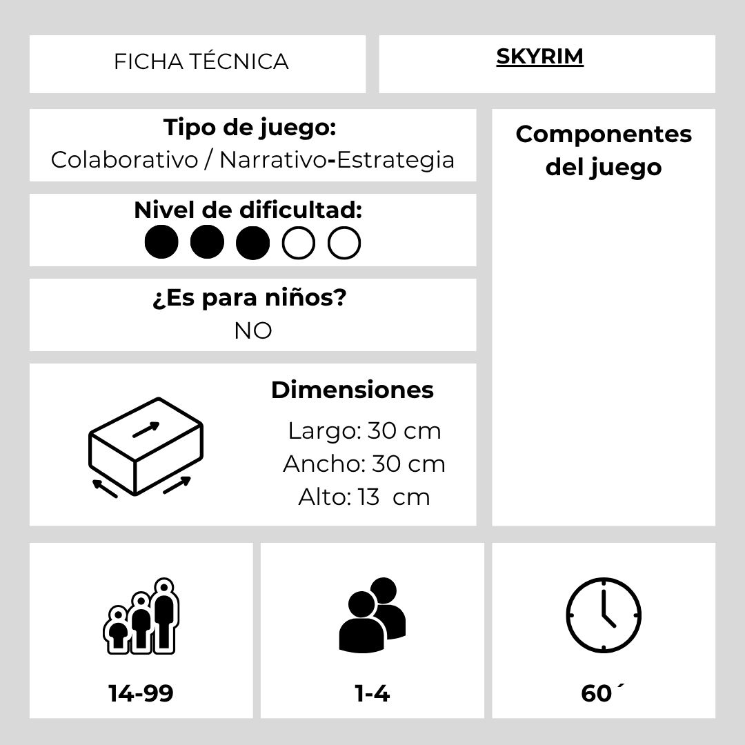 Sumérgete en el vasto y fascinante mundo de Tamriel como nunca antes. SKYRIM: EL JUEGO DE AVENTURAS te invita a construir un carácter único, mejorar tu equipo y profundizar en mazmorras llenas de peligros. Cada decisión importa, cada elección forja tu leyenda mientras ganas experiencia, encuentras tesoros invaluables y te enfrentas a Draugr, Daedra, Dragones y un sinfín de criaturas que desafiarán tu coraje.